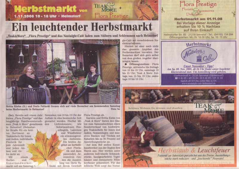 Herbstmarkt am 1.11.2008, von 10:00 bis 18:00 Uhr bei "Teak & More" und "Flora Prestige", Helmstorfer Str. 85. Teak & More, Flora Prestige und das Nostalgie Café laden zum Stöbern und Schlemmen nach Helmstorf